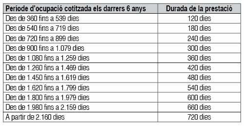 La durada de prestació per desocupació està en funció dels períodes d’ocupació cotitzats els 6 mesos anteriors a la situació legal de desocupació (o en el moment que cessa la obligació de cotitzar), o des del naixement de la prestació per desocupació anterior.